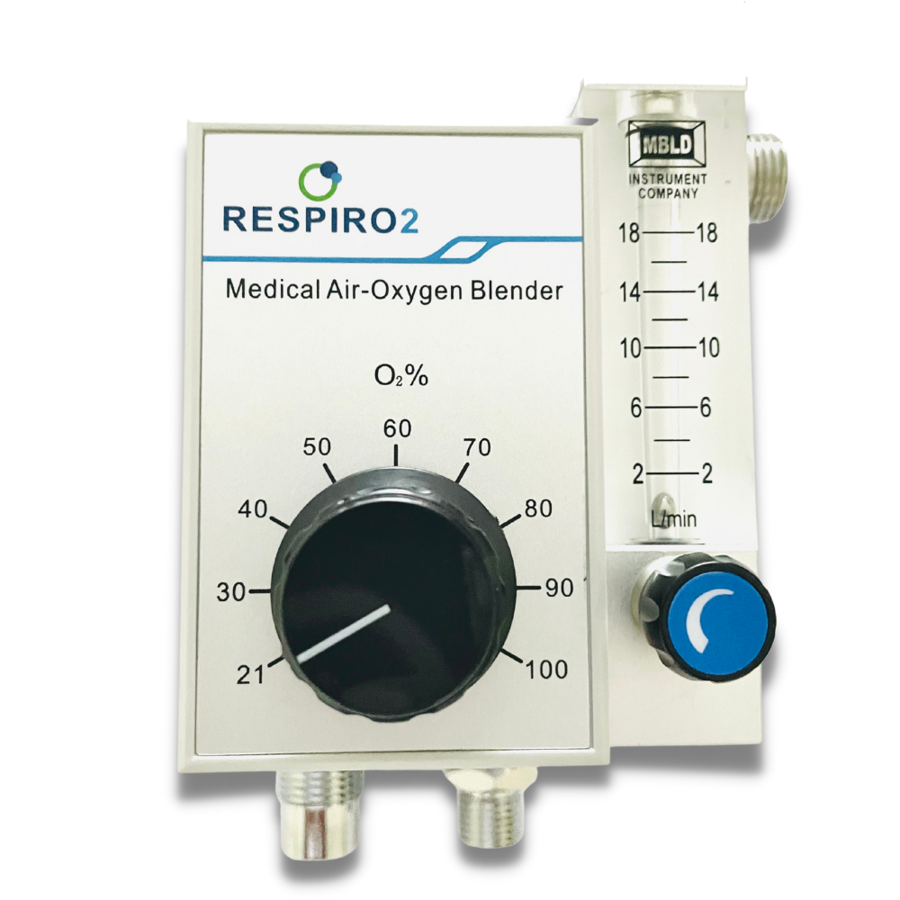 La mezcladora de aire oxigeno de RespirO2, es un dispositivo utilizado por el personal médico para controlar la concentración y el flujo de oxigeno, para el rescate de pacientes con problema de hipoxia y para evitar los efectos secundarios de la inhalación de oxigeno puro