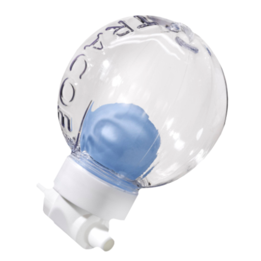 Mantiene entre 20 y 30 cm H₂O. El globo amortiguador azul es para el control visual.