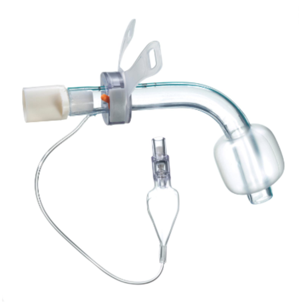 Cánula de traqueostomía con escudo ajustable, manguito de baja presión, tira de contraste para rayos X, escala y conector de 15 mm.
